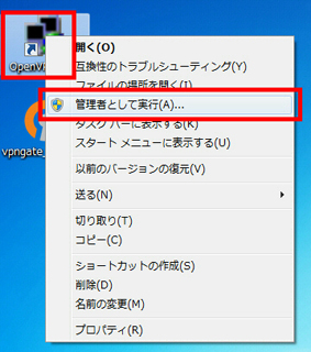 Windows Vista 以降では「管理者として実行」をクリックして実行しない場合は VPN 通信を行うことができませんので、ご注意ください。