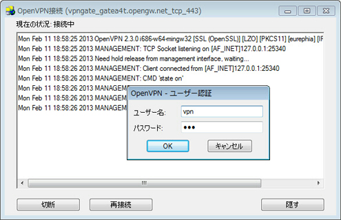 途中でユーザー名とパスワードを入力する画面が表示される場合があります。この場合は、両方とも「vpn」 (3 文字) と入力します。(通常は表示されません。)